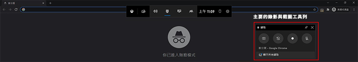 步驟1:按下遊戲錄影快捷鍵「 Win + G 」,會跳出一系列的工具列,上方的主要工具會有簡單的音訊調整、擷取、效能跟其他小工具,而另外一列擷取工具列則能看到照片截圖、錄影前30秒擷取、螢幕錄製,還有錄影時的麥克風設定。