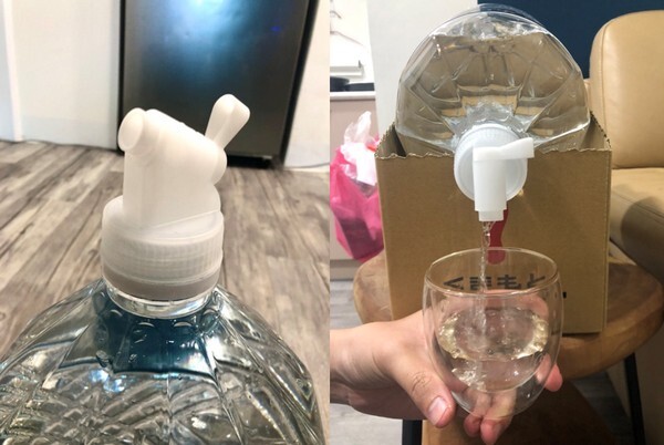 他們有600ml小瓶裝跟6000ml的大桶裝,外包裝有超可愛的熊本熊logo。我現在都是買大桶裝的,有別於一般外面市售的大桶水,每次買回來都要再倒在水壺中,因為直接倒太大桶很重又容易濺出來!他們家的大桶水都是有他們特製的紙箱包裝,而這個紙箱不要丟掉喔!跟著箱上的指示操作會搖身一變成為簡易飲水機支架,用好後再把大桶水放上去就秒變一台小飲水機了,而且他們還會附上一個有點像水龍頭的儲水頭,直接取代瓶蓋,輕輕鬆鬆就就可以即開即飲了喔!這個設計小巧思真的很棒又很實用~