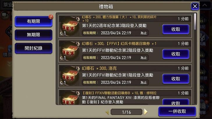 接著再去禮物箱領取滿滿的16頁資源,當中會取得不少道具