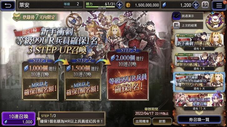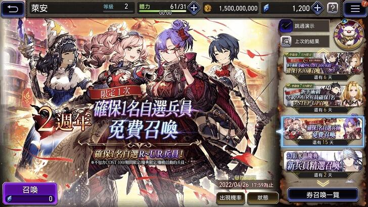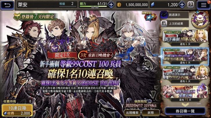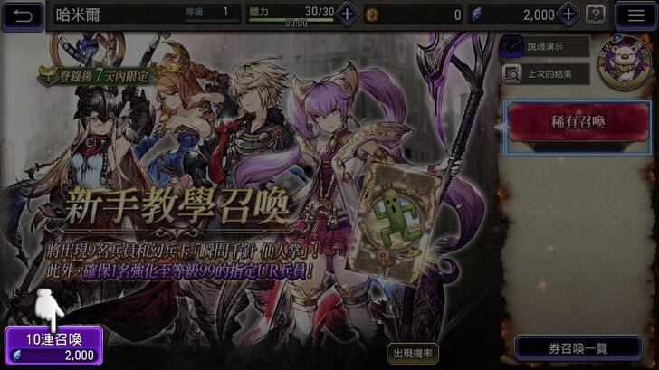 下載後登入遊戲結束新手教學後會有必中99等UR兵員