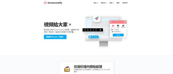 Screencastify是一款來自chrome擴充功能商店的螢幕錄影工具,只要一次安裝就能使用快捷鍵叫出螢幕錄影程式,不需要再從書籤翻出螢幕錄影的其它網頁版,在使用上相當直覺。