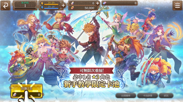 而刷首抽的方式也非常簡單,只要通過新手教學結束1-2章節以後,就可以先用精靈石來個20連抽,當發現抽不到自己滿意的角色,回到一開始的畫面,進行玩家資料刪除,就可以再進入遊戲,動畫全程SKIP跳過也不用再跑一次新手教學,不到2分鐘又可以進行重刷首抽!