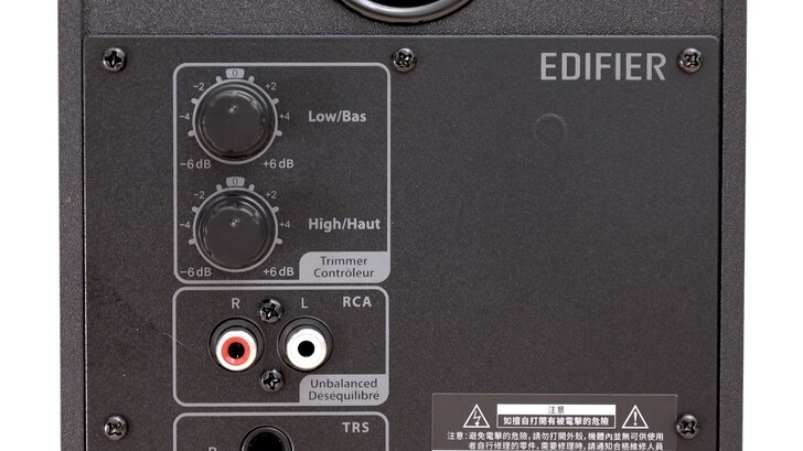 稍微往下看到金屬面板右上角有 EDIFIER LOGO,左邊有低音、高音的調整,可以 ±6db。