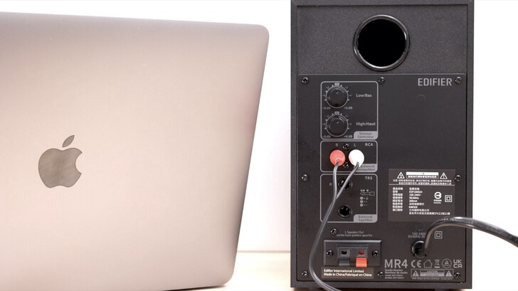 接著是一組 RCA 輸入 -10dBV,以及一組 TRS 平衡輸入 +4dBu。實測單顆高度 225mm、寬140mm、深 170mm,一旁的 MacBook Pro 13 可以作為尺寸參考。