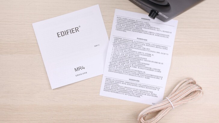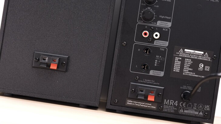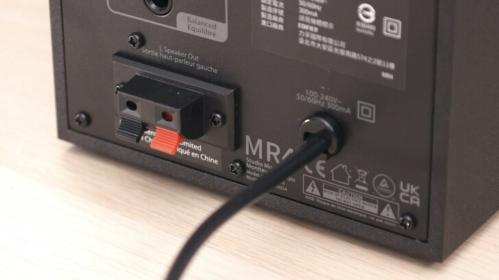 下方則有一個 4" 的單體,標榜 PP 振膜和 MICA 材質,低音表現不俗。MR4 是主動喇叭,採用 Texas Instruments 的 TAS5713 方案。規格標示響應頻率為 60Hz~20KHz,SNR ≥ 85dBA,THD+N ≤ 0.2%。