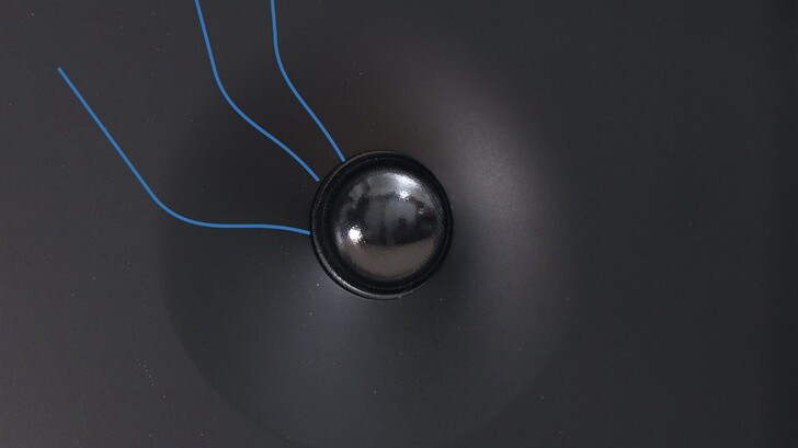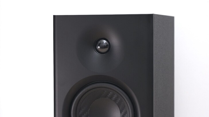 上方為一個 1" 的絲質高音振膜。音箱整體外殼使用木質,可以減少共振,敲起來的聲音也滿堅實的,官方標示一對喇叭重量約 4.5kg。