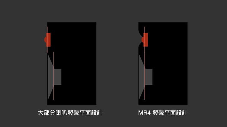 此外有一些設計上的細節,是高級喇叭才有設計,沒想到 MR4 也用上。像是高音單體周圍的面板弧形內凹設計,不只是為了美觀,而是有聲學設計過的曲線,能讓高音更均勻的向軸心外的方向擴散,不會只有在前面軸心上的聲音,可以讓整體的聲音才更自然平衡,讓近距提聆聽有更好的定位感,也就是會有較好的立體感。