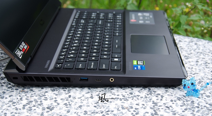 C面主要為鍵盤與觸控板,此區域質感對人體最為重要,與手指或手腕頻繁接觸,採用與A面相同的金屬霧面材質,在高階機種中C面接觸質感還算不錯,鍵盤依然採用與SteelSeries合作打造的RGB按鍵,搭配專屬軟體可調整想要的燈號,薄膜式鍵盤在敲擊手感會偏軟一些,不過對比許多薄膜式還是有較佳的手感,觸控板操作定位相當精準,觸控區域若能再加大會比較符合近年新機種的設計。