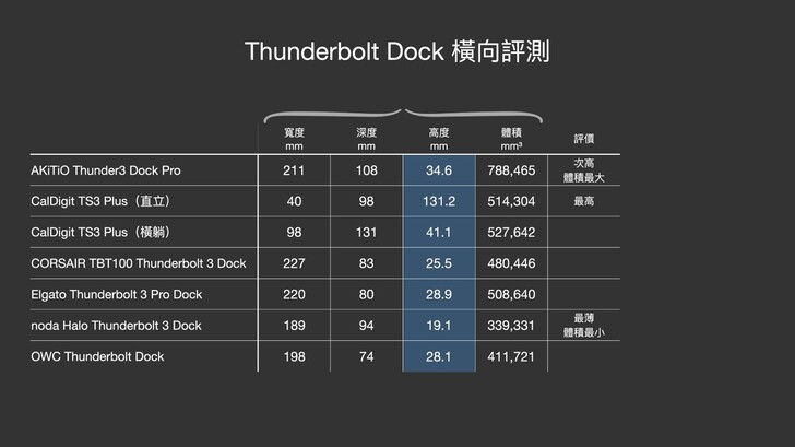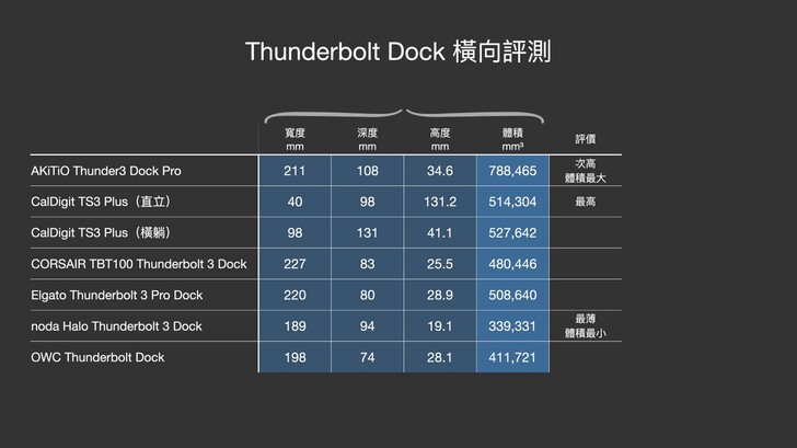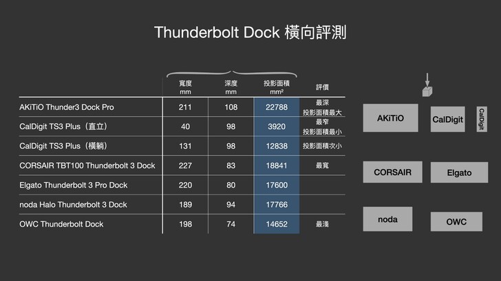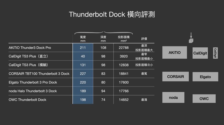 在深度部分,AKiTiO 以 108mm 超越所有競品城為最寬的存在。而最窄的則是 OWC 推出的 TB4 Dock,僅有 74mm。
