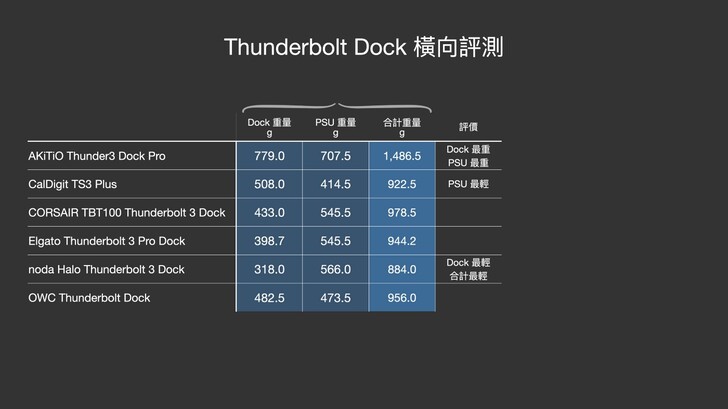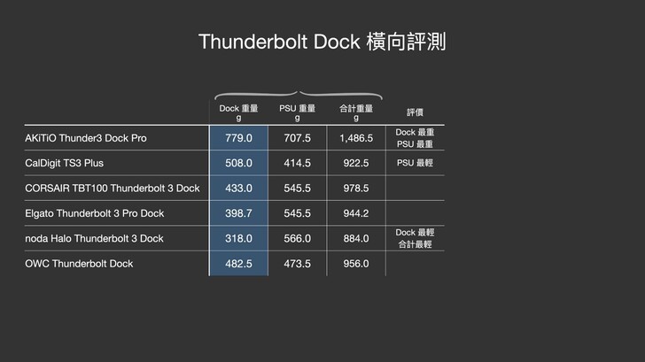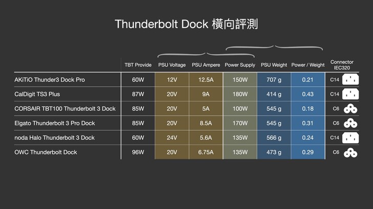 有趣的是,我們可以將電源供應器的重量單獨拉出來看,並且配合上電源供應器標示的瓦數,將瓦數除以電源的重量得到每顆的瓦數。其中的這 CalDigit 的瓦數是最高的,達到 0.43,甚至是有些品項的兩倍以上了。