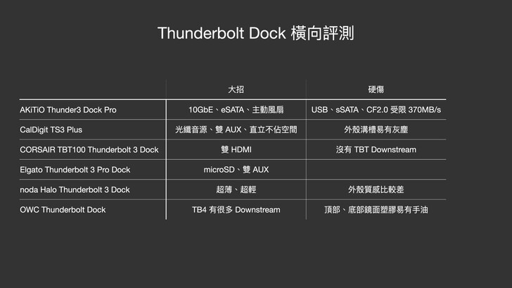 以上我們花了 10 分鐘對每一台 Dock 都已經有一個初步的印象跟概念。接下來我們會從另外一個角度,從各個面向去考慮這六台他們有什麼特色,跟他們做得好做得不好的地方。