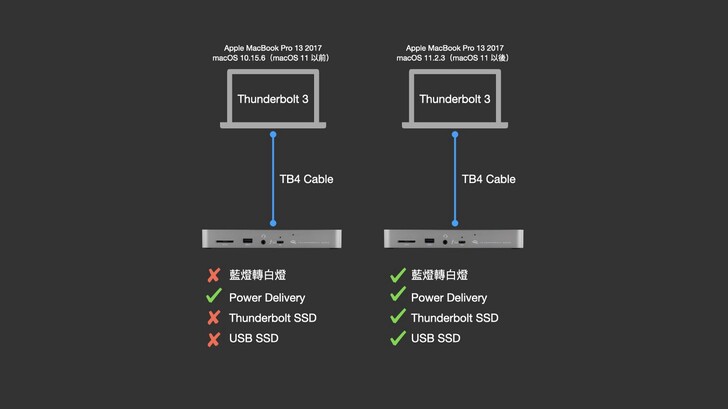 其中 Mac 又比較有趣,以 OWC 這台來說,如果你是 Intel CPU 且支援 Thunderbolt 3 的款式,將作業系統升到 macOS 11.1 以上,也可以使用 Thunderbolt 4,三個下行也可以正常運作。而 Apple M1 的電腦則是都可以直接使用,OWC 官方已經確認沒問題。先前製作影片時,我們訂了一台 M1 Pro 的 Mac Studio 還沒到貨,現在到貨也簡單測試了一下,是可以正常運作,沒有發現問題。
