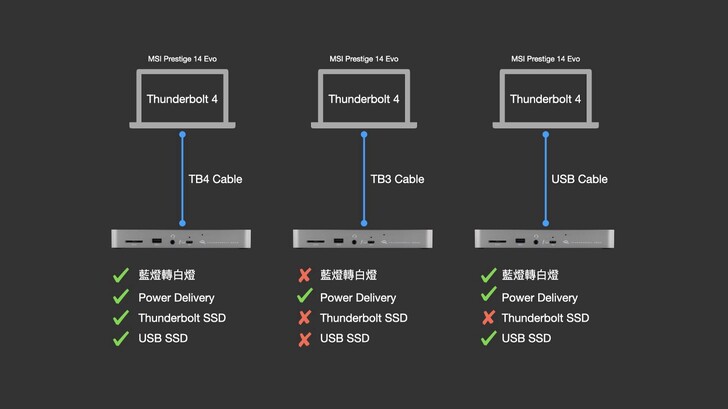 而在 Windows,以 MSI Prestige 14 Evo 為例,當使用的連接線是 TB4 時,外接和所有功能都可以正常運作。當連接線是 TB3 時,只有充電功能可以運作。當連接線是 USB 時,充電和 USB 傳輸都是正常的,只有 Thunderbolt 功能無法啟用。