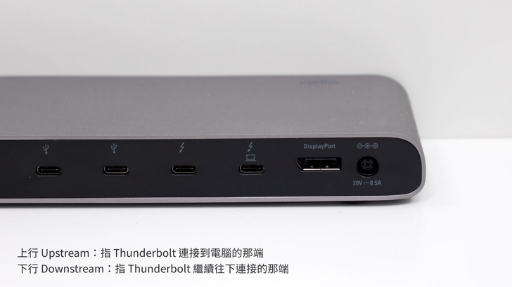 類似的大概就是比較新推出的 OWC 那台。他的 Thunderbolt upstream 是在前面,讀卡機、耳機接孔也都在前面,對於筆電使用場景來說的確是比較合理。其他很多品牌在 TB4 這代,也採用類似的佈局,就呼應了我過去開箱評測這些 Dock 給出的建議。而 TB4 速度雖然沒變,但是現在新的 Thunderbolt 4 可以做到一個 upstream、三個 downstream。以前在 Thunderbolt 3 時代,Thunderbolt 只能有一個 downstream。而因為 Thunderbolt 3、Thunderbolt 4 都有支援 USB,所以直接用 USB-C 線接出來不管是插 Thunderbolt SSD 還是 USB SSD 都會方便很多。