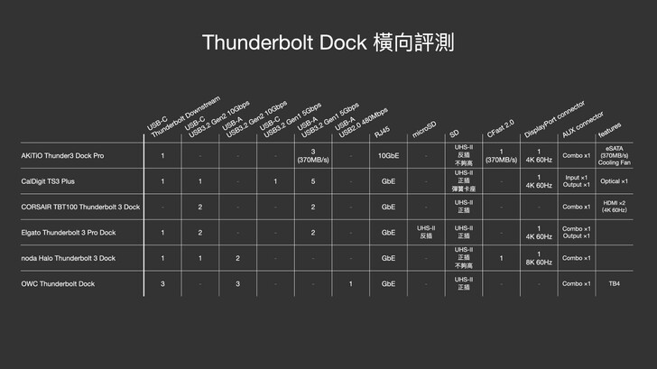 除了這次評測的這六個常見的品牌,我也有玩過、用過 ATEN、Belkin、Dell、Kensington、Opro9、Razer、UGREEN……等,這些牌子的 Thunderbolt Dock,有的廠商推出也不只一款。但有些沒有在台灣賣,那你就不要問我怎麼拿到的了 XD 因為手上沒有每一台 Sample,所以重點還是會放在手上有實機而且我使用很久的這六台,以我用過十幾台的經驗,來比較他們彼此的優缺點。