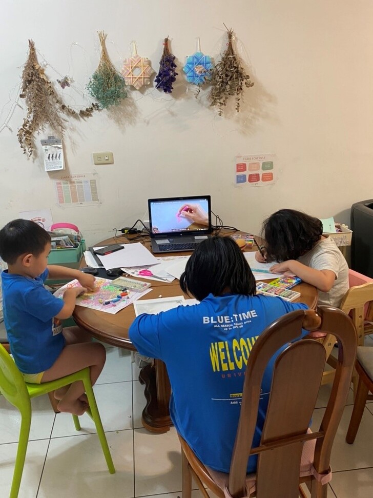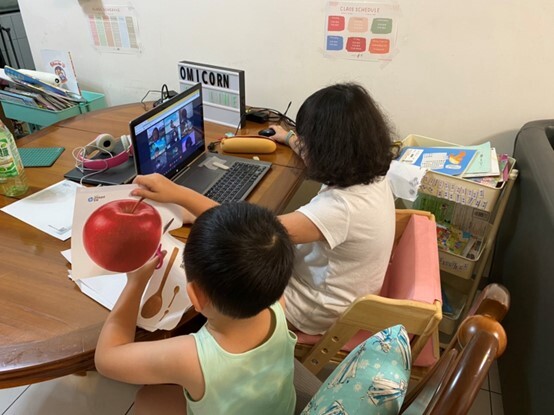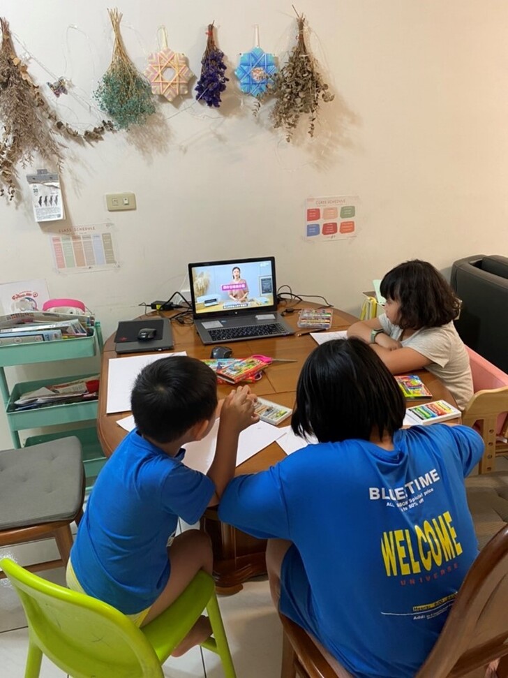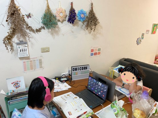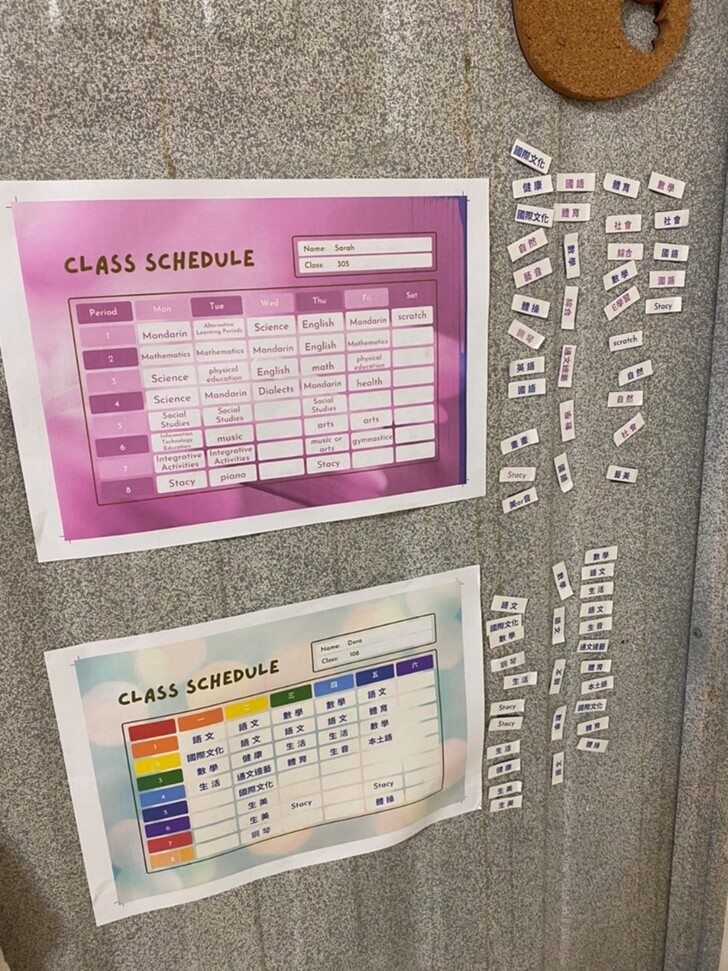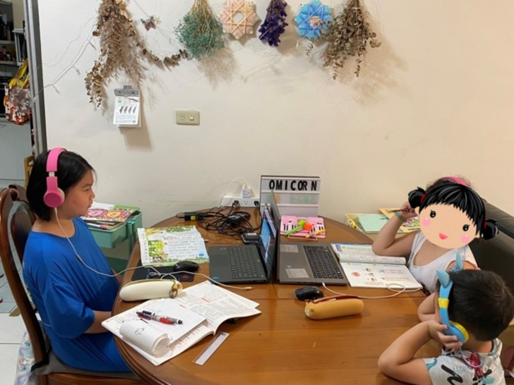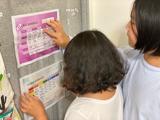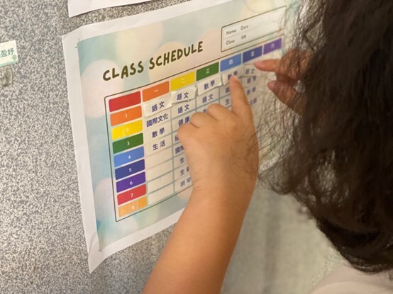 牆壁上貼的時間表是學校停課期間線上課程時間