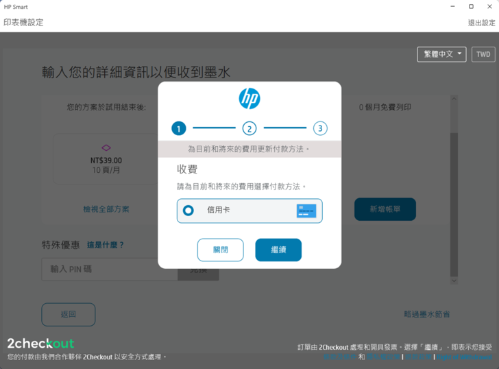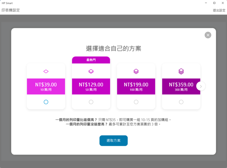 方案選擇,預設是每月129元的方案,可以印50頁,如果怕太多也可以自己改成39元的方案,不過每個月就只有10頁,另外每35元可以購買一組10-15頁的加購組合。