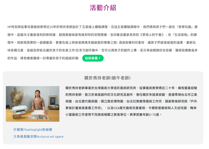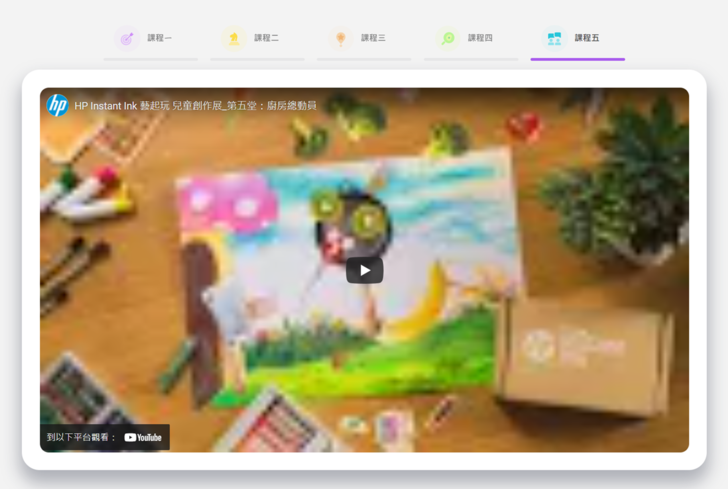 接下來就分享一下參加這個HP藝起玩!兒童創作展的過程記錄吧!HP特別與從事兒童藝術教學的秀玲老師合作,設計了五堂線上體驗課程,特過這些課程讓孩子與父母一同來一趟創意的想像之旅。透過各種列印素材,讓孩子用拼貼及圖畫一同創造出屬於自己的作品。