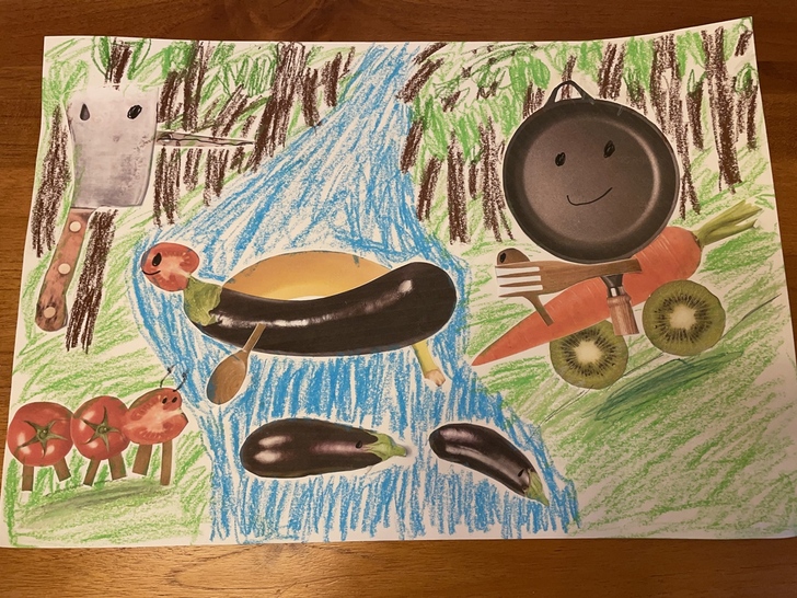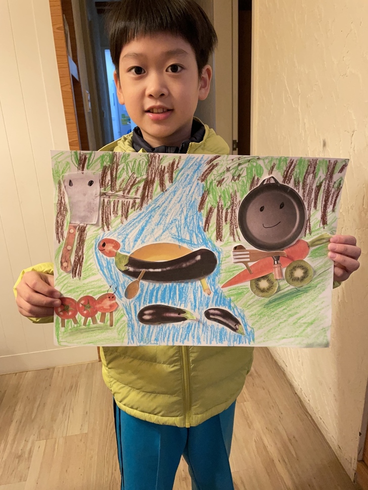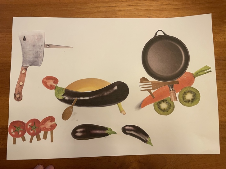 小朋友的拼貼結果:圖畫中間的茄子及香蕉是烏龜,下方的兩顆小茄子是蝌蚪,左上方的菜刀及剪刀頭是啄木鳥,左下方的小蕃茄是螞蟻,右方的鐵鍋、胡蘿蔔、奇異果是小朋友騎腳踏車。