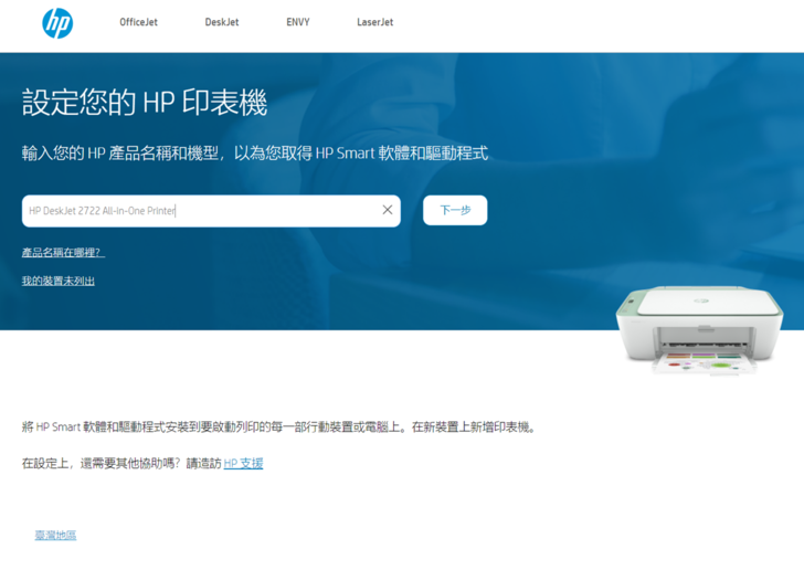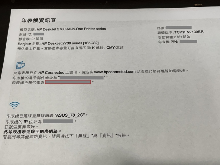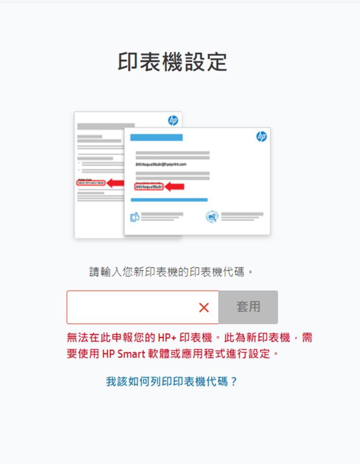 輸入印表機代碼,我想很多人會卡在這裡,印表機代碼並不會顯示在機身的任何部位,而是需要透過印表機連線HP並完成設定,再列印出印表機資訊頁。