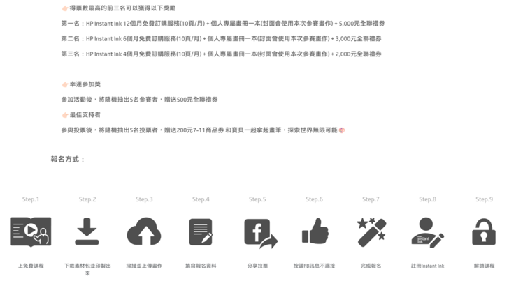 作品完成之後要上傳活動專區,並自行拉票,得票數最高者可以獲得獎勵,不過因為獎勵是HP Instant Ink的免費訂購服務,所以也限定有訂購HP Instant Ink的用戶參加。