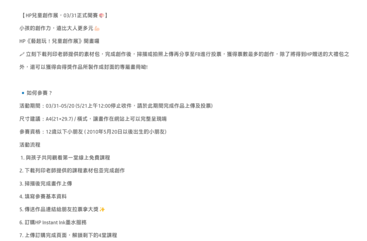 兒童創作展於3/31日正式開賽,活動期間為3/31-5/20,參賽資格必須是12歲以下的小朋友,國中生就無法參加了。