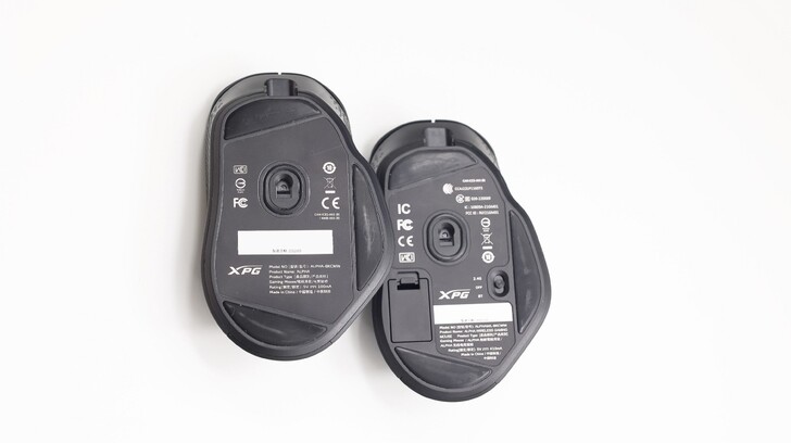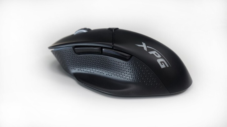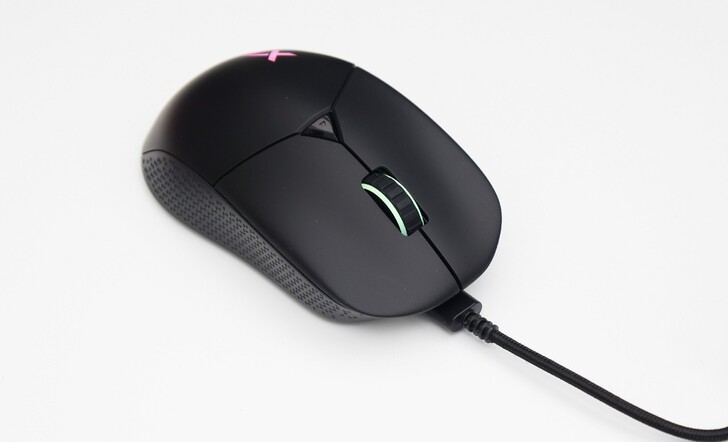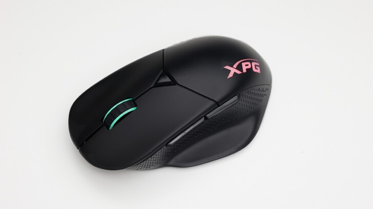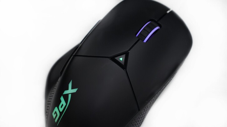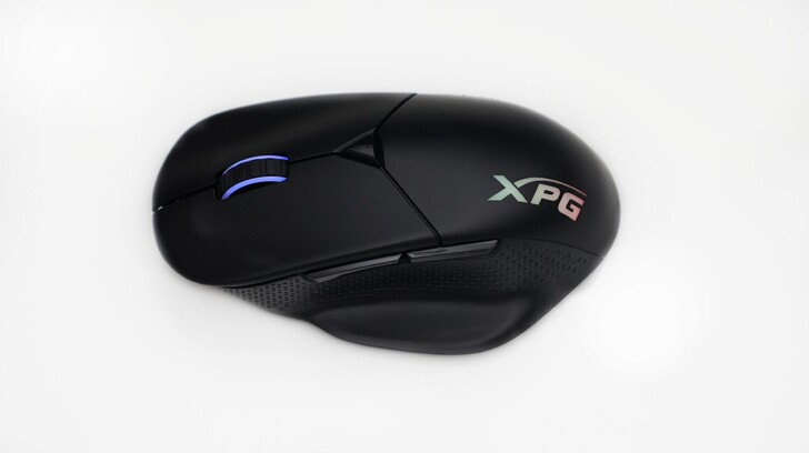 從上面看,左下角是 RGB 的 XPG 標誌,中間三角形按鍵是靈敏度調整鍵,DPI 提供 100 至 16000。燈光會隨著靈敏度改變,個人最喜歡紫燈時的靈敏度(DPI 400)。