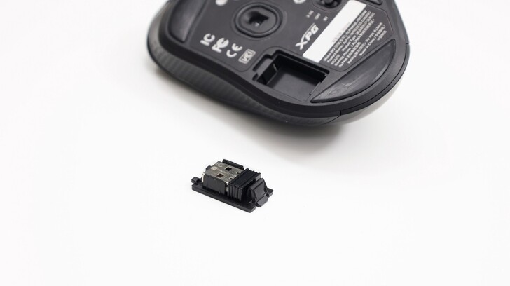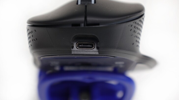充電和連接為 USB-C,連接孔在前面。很特別的是它在接頭處設計了滑軌,讓使用者更方便插入 USB-C,也不容易鬆脫和斷掉。這點是其他滑鼠沒有的設計!