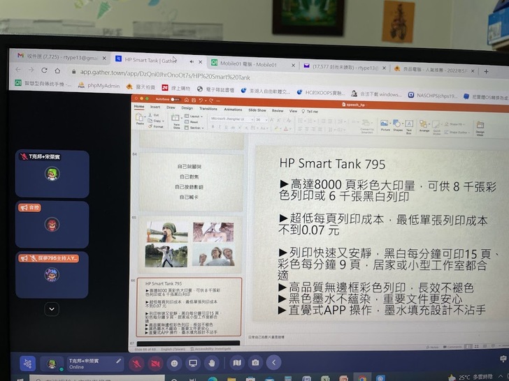 這個結合 Gather Town網站線上講座系列參與過來讓我們知道自由工作者的成長及訣竅,以網路線上的方式來參與,也讓我們知道對於工作上有幫助的利器 HP SMARTTANK 795 ,讓我們希望日後還能有機會參加類似的講座。