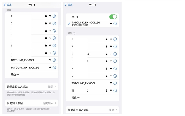 ▼ 可以直接開啟WiFi 找到SSID TOTOLINK_EX1800L或TOTOLINK_EX1800L_5G 選擇連線