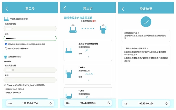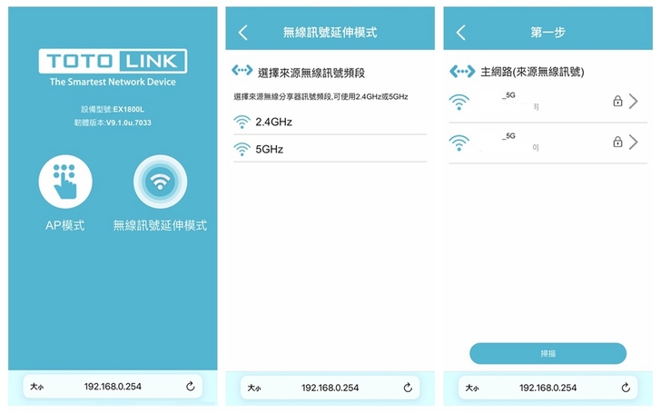 ▼ 透過瀏覽器連結 192.168.0.254 進入設定,選擇無線訊號延伸模式,選擇需要延伸的2.4G或5G,選取欲延伸的基地台