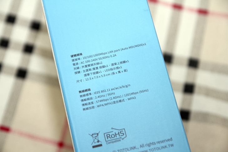 ▼ 硬體規格有一組LAN PORT 1000Mbps 提供有線網路,無線網路速度 2.4G 574Mbps 5G 1201Mbps 並支援WPA3加密