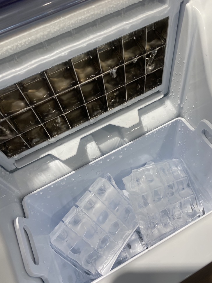 經過大約25分鐘運轉,製冰完成,一次24顆冰塊,製冰機會運作快速讓方冰脫模,幾十秒時間後,漂亮的方冰就落到儲冰籃中了,裡面還附有一支舀冰杓子,取冰真方便。