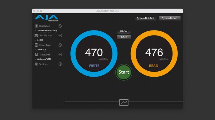 以 AJA 測試 64GB 檔案,寫入 470MB/ s,讀取 476MB/s。