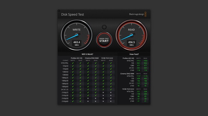 在 Blackmagic 中,設定檔案大小 5GB,測試速度達到寫入 463.4MB/s,讀取更是達到 456.5MB/s。