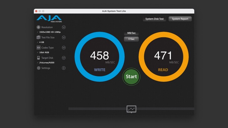 以 AJA 測試 4GB 檔案,寫入 458MB/ s,讀取 471MB/s。