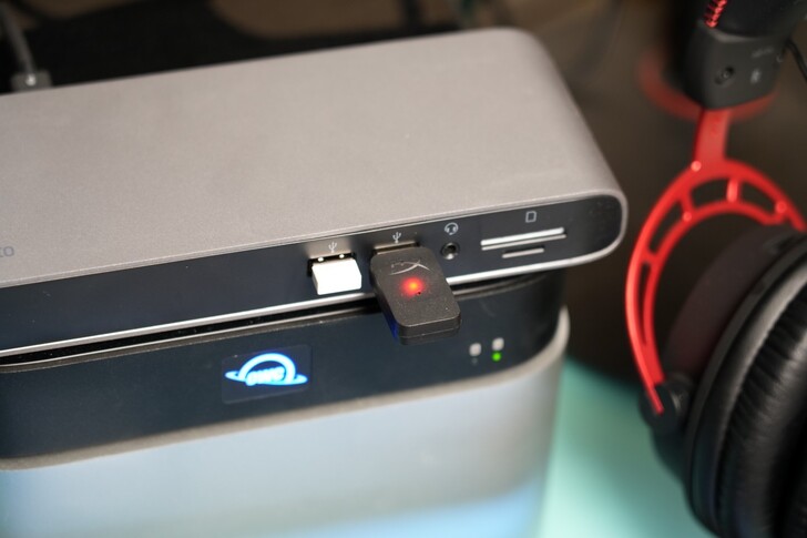 耳機的 2.4GHz 接收器外殼為半透明黑色,插上之後會亮起紅燈,閃爍的話代表未連接,常亮則代表已連接。