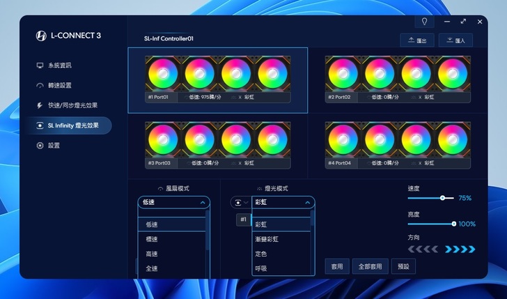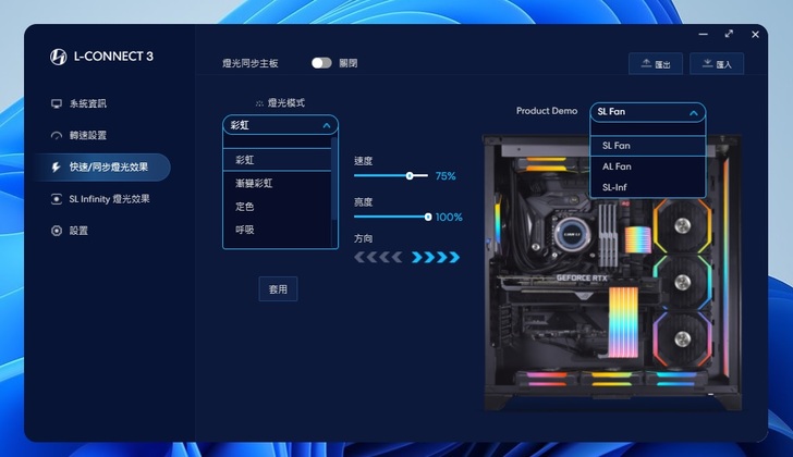 ▼SL Infinity 燈光效果。輕鬆調節 UNI FAN SL 系列風扇速度、LED 顏色、亮度和燈光效果。
