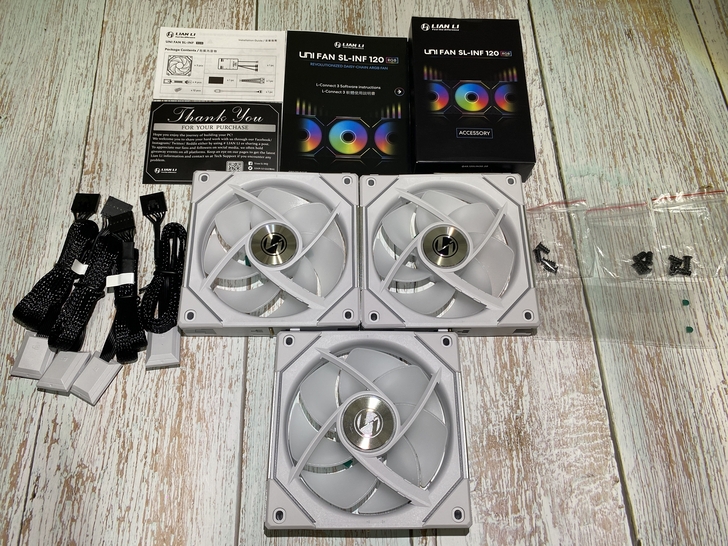 硬體安裝說明書、感謝卡、軟體安裝說明書、燈效控制器 、 電源連接專用線 x3 、風扇 x3、 螺絲包X3。