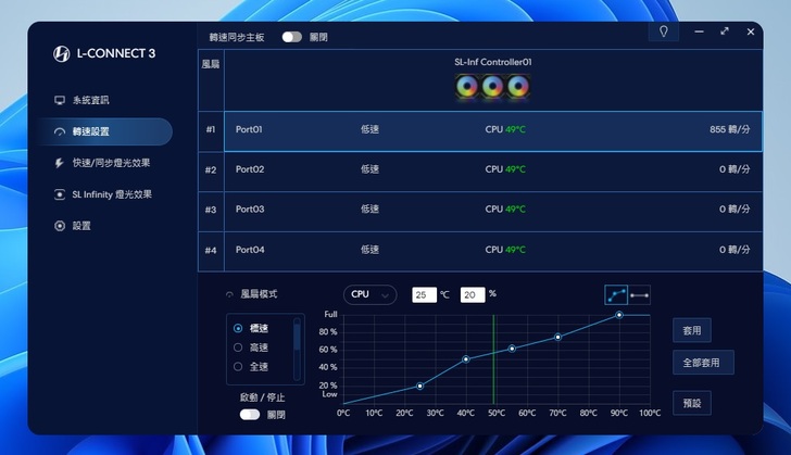 ▼轉速設置。創建個性化的風扇配置文件並定義每個風扇曲線以實現最終操作。