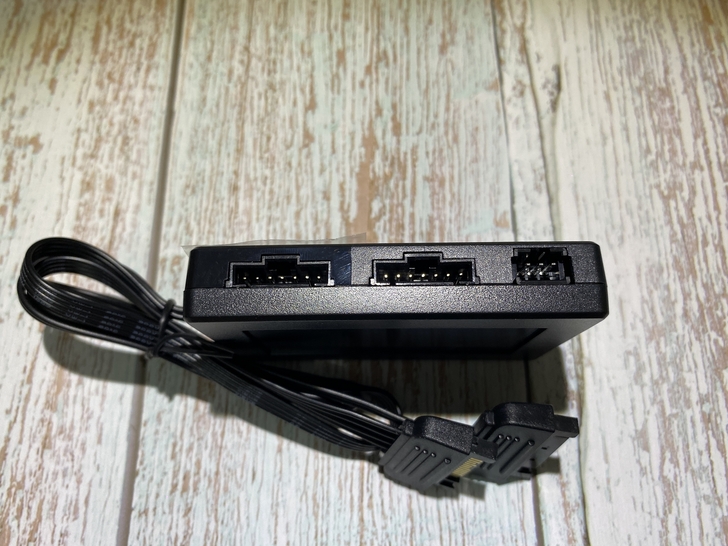 ▼燈效控制器及其配件 : 供電使用一般的SATA電源(共有2組),背面有配置一塊固定貼能將其固定在機殼上。