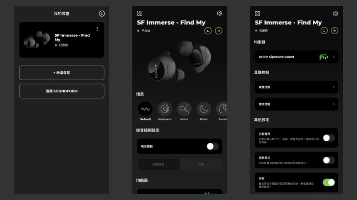 圖片呈現 SOUNDFORM 程式的其餘功能。一支手機就可以新增多種裝置。另外,播放音樂時能夠即時切換喜歡的模式,共有六種。我最喜歡 Immerse 模式,帶入感強又凸顯宏亮低音。除了可一鍵切換降噪 / 通透模式,均衡器也多達 15 種預設值,若不滿意還可以自訂。