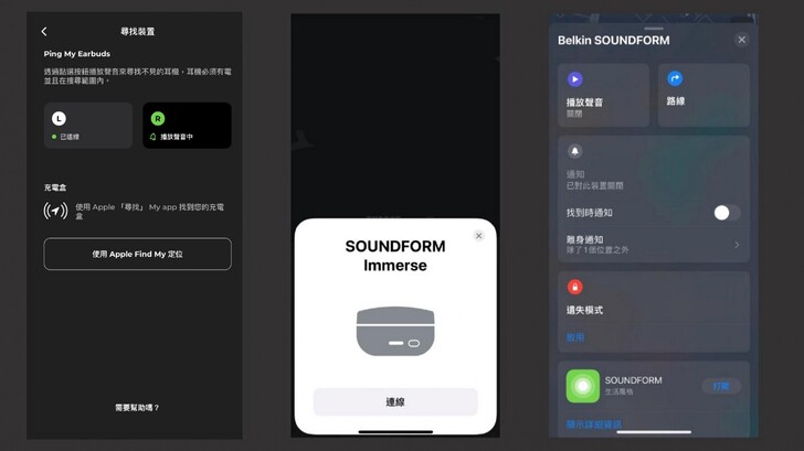 Immerse 耳機與耳機盒都有防止遺失的功能。可以透過 SOUNDFORM App 內的「Ping My Earbuds」找到每隻耳機(左圖)。也可以透過 iPhone 的「Find My」定位,找出 Immerse 藍牙耳機盒的位置,甚至能夠觀看物品距離自己多遠(中圖及右圖)。結合 Apple 的地圖,也可以與其他人分享裝置位置並導航自己到 Immerse 耳機的路線。