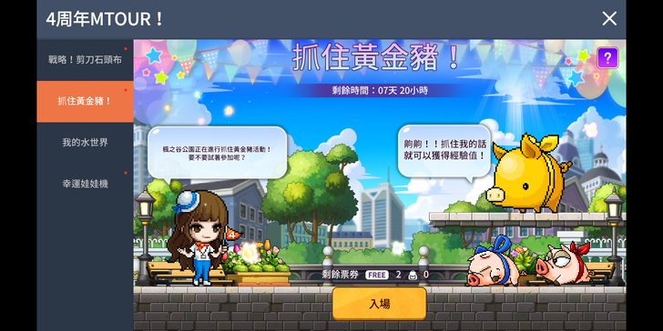 第二站”抓住黃金豬!”非常簡單的打豬遊戲,每天免費入場2次,只要打的豬越多就可以拿到越多的經驗值,派出你最強戰力的角色上場就能滿載而歸了
