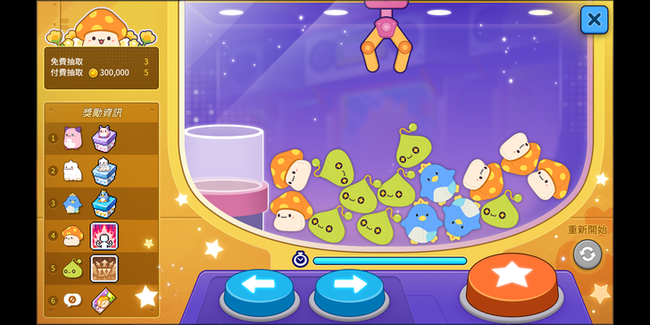 第四站”幸運娃娃機”非常簡單夾娃娃,夾到的東西都很實用,建議楓幣也通通用上把娃娃夾光光才會更新娃娃機內的娃娃,夾好夾滿可以拿更多的硬幣
