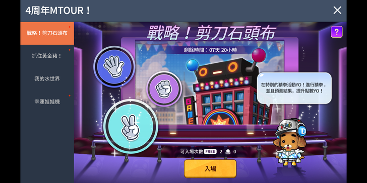 第一站”戰略!剪刀石頭布”,活動時間內每天可以免費入場2次,跟其他玩家玩玩誰的剪刀石頭布比較厲害,不管輸贏都有硬幣可以拿,所以就算輸了也不用擔心