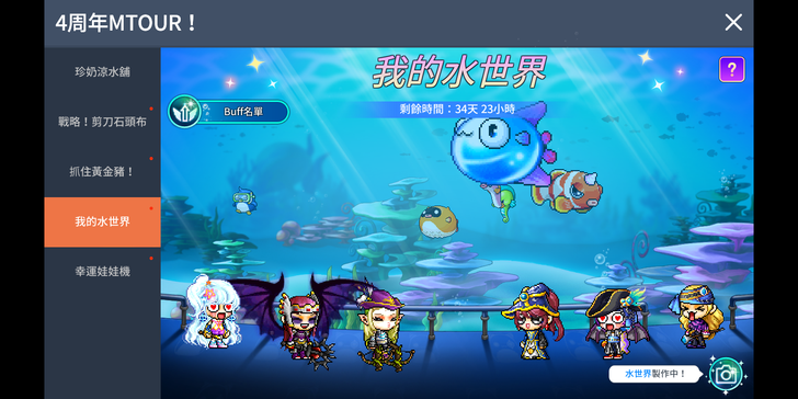第三站”我的水世界”把60級以上各個職業的角色都放上去,能增加許多BUFF讓所有角色通通都有加乘,只要把每天拿到的飼料餵魚還可以增加BUFF的等級,最終還可以拿到水世界的椅子,分身練起來