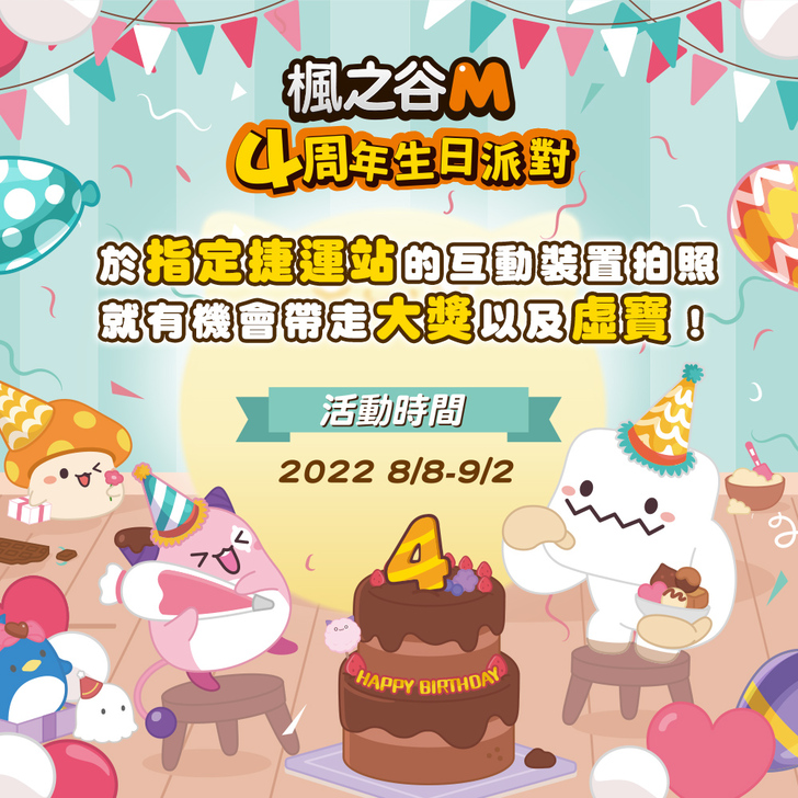 當然還有每年都有的線下活動8/8 - 9/2 於台北捷運站(101/世貿站、中山站、忠孝新生、公館站)推出 4 周年限定活動, 透過活動獲得豐富的遊戲內虛寶以及iPhone13、楓之谷M&HyperX聯名限定款耳機!