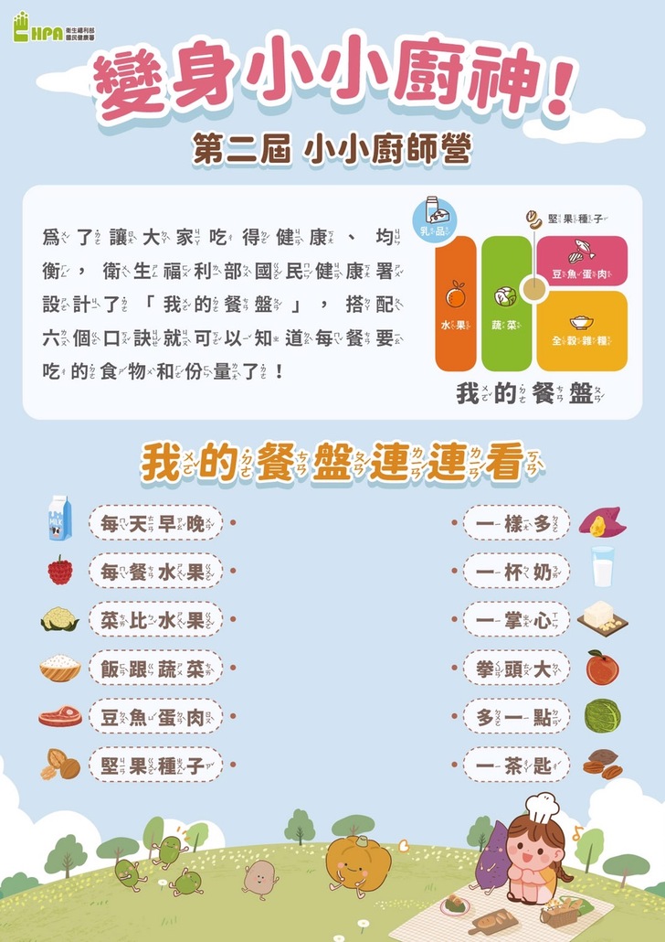 第⼆屆⼩⼩廚師營熱烈開始囉!去年熱烈迴響,今年國⺠健康署再度擴⼤舉辦,於8⽉6 ⽇活動正式開始。今年特別規劃兩檔課程:「我的餐盤與全穀雜糧」、「質地調整飲食」, 透過線上課程影片、料理實作、學習單及線上⼩⼩隨堂考的形式,讓家長及⼩朋友⼀起互動 學習正確的營養均衡觀念,隨著貼⽂指引,完成指定任務即可參加抽獎,總獎⾦超過7萬元,活動精彩豐富,邀請家長帶著⼩朋友⼀起踴躍報名。