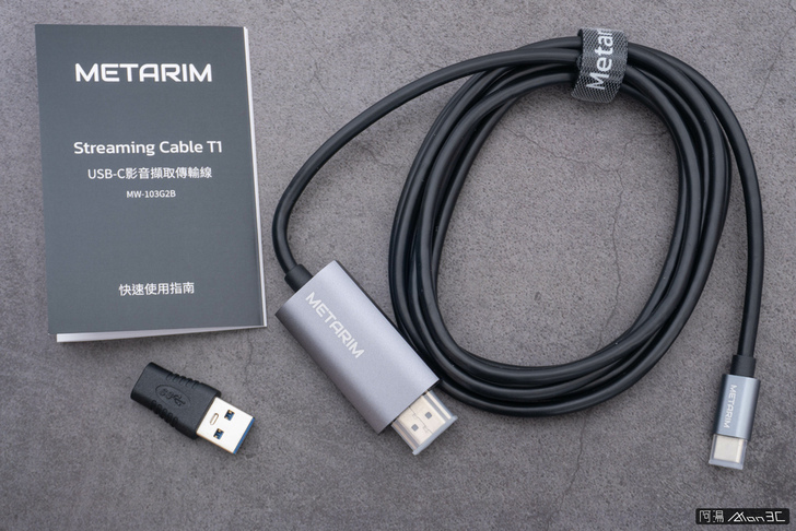 內容物一覽,有著說明書、USB-C 轉 USB-A 轉接頭、影像擷取線本體。